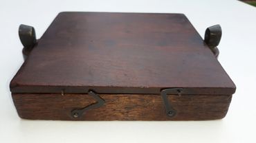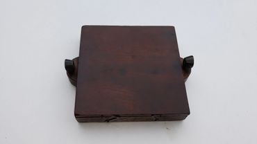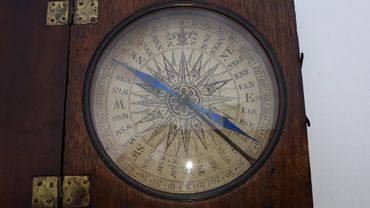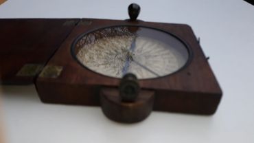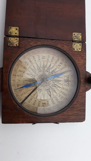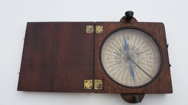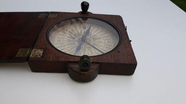 The sighting holes are made of metal seated in a wooden base with their line of sight coinsiding with the North/ South markings on the paper compass dial.